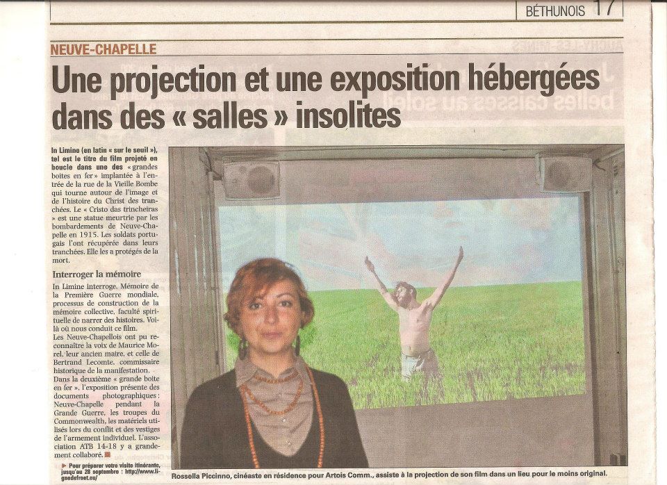 Voici un article apparu sur la Voix du Nord sur mon film « In Limine », actuellement projeté à Neuve-Chapelle, tous les jours de 10h00 à 18h00, dans le cadre de l’exposition « Ligne de Front« . L’expo terminera le 28 Septembre.