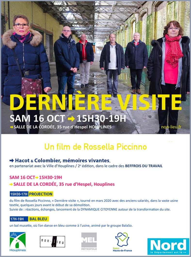 Je vous attends ce samedi 16 octobre 2021, de 15h30 à 19h00, dans la salle de la cordée, au 35 rue d’Hespel, à Houplines, pour la projection de « DERNIÈRE VISITE », un film qui me tardais de vous présenter, tourné en mars 2020 avec des anciens salariés, dans la vaste usine textile Hacot&Colombier, quelques jours avant le début de sa démolition.