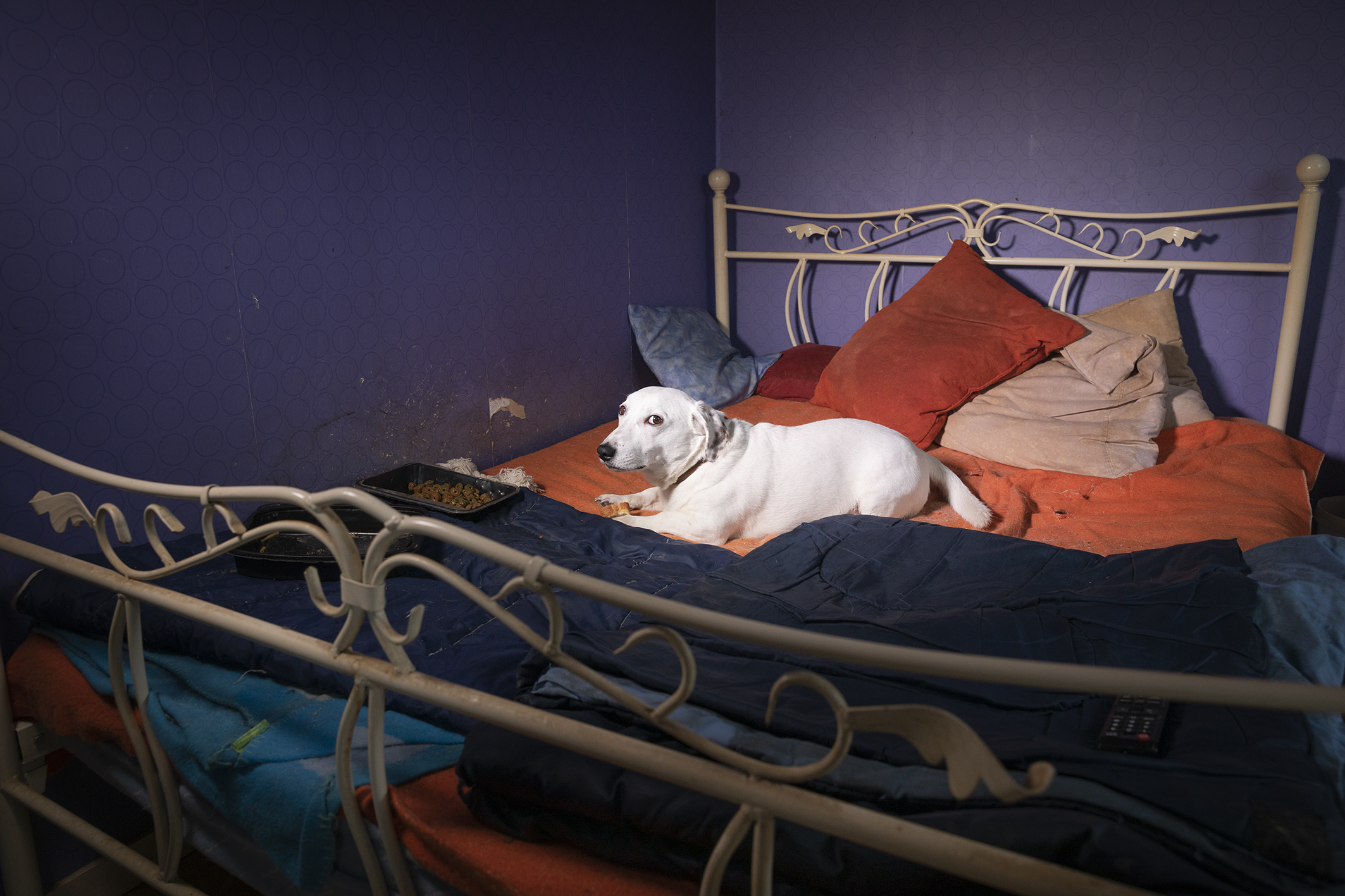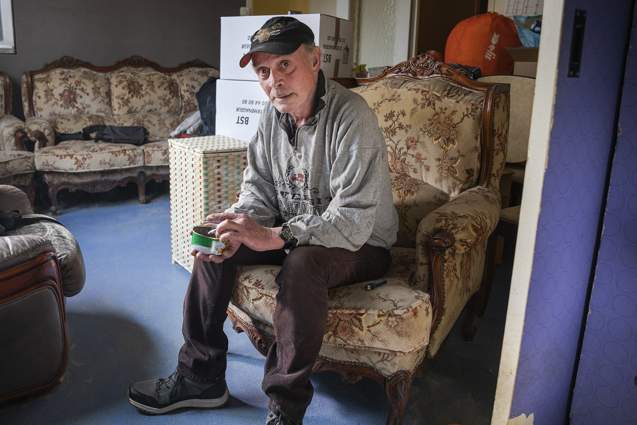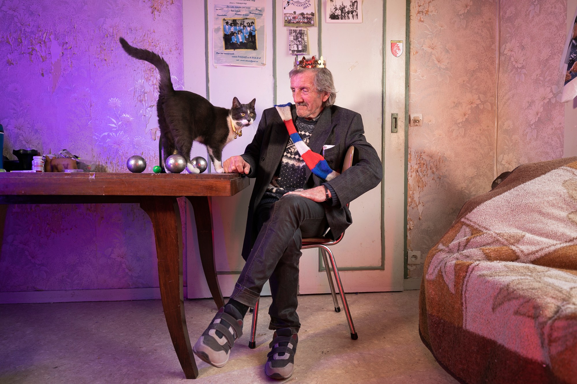 Le matin du shooting, je trouve et ramène avec moi une couronne en carton de la galette des rois afin de compléter la mise en scène. Il nous accueille chez lui avec ses deux chats. La place qu’ils occupent dans sa vie est très importante. Il est aussi affectueux avec eux qu’il le serait avec ses propres enfants.