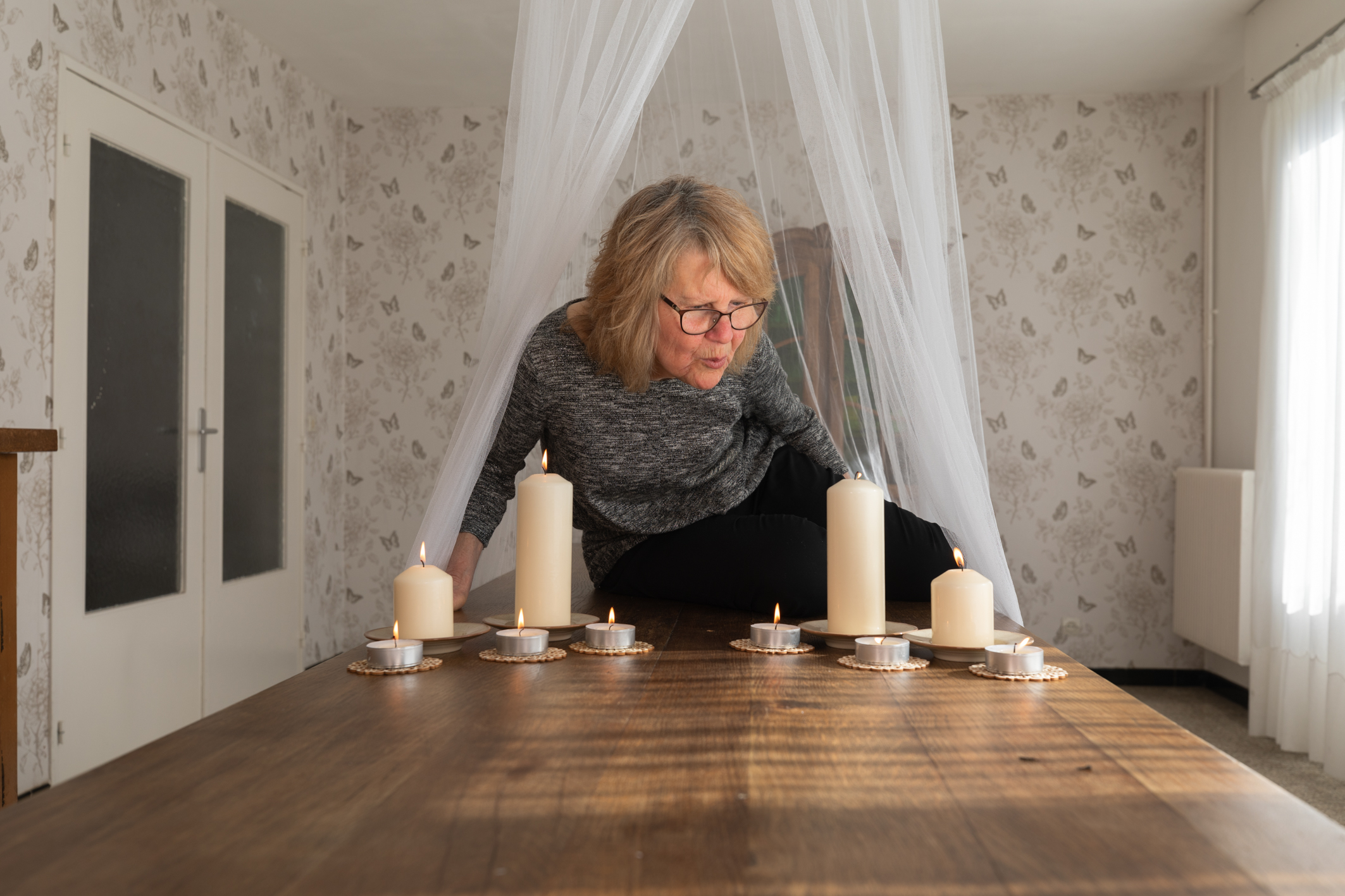 Le jour du shooting, elle nous accorde beaucoup de temps. On pose la moustiquaire sur la table et on dispose des bougies pour rappeler la sacralité des moments qu’elle a évoqués.