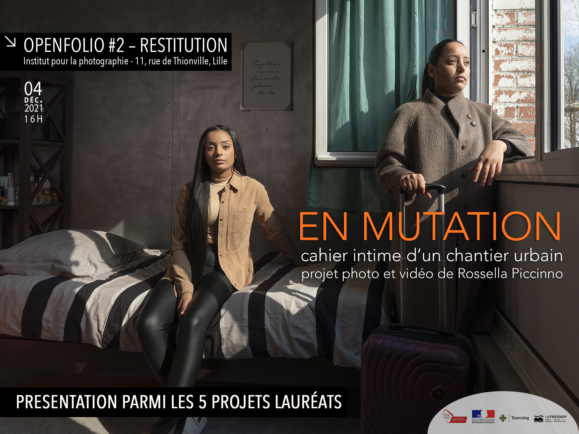 CREDITS : L’exposition “En Mutation” a été conçue dans le cadre du projet “Bourgogne terreau d’identités : mémoires partagées” porté par le Centre Social Bourgogne-Pont de Neuville et par l’artiste Rossella PICCINNO | Projet encadré par Hamida HAFID Chargée de Mission, Harold GEORGE Directeur du Centre Social Bourgogne-Pont de Neuville | Nous remercions la ville de Tourcoing et la Préfecture du Nord sans qui l’exposition n’aurait pu avoir lieu | Nos remerciements particuliers à tous ceux et celles qui ont collaboré à la réalisation de cette exposition | Nos merveilleux témoins : Michel, Daniel, Marie-Odile, Armande, Fatima et ses petites-filles Soumia et Safa, Régina, ses filles, Magina et Madeline, son petit fils, Anthony de Bonheur | Le Fresnoy – Studio national des arts contemporains pour l’accompagnement, l’impression et les conseils précieux Lucie MENARD, Responsable Service Culturel et Éducatif et Boris ROGEZ, Impression des photographies de l’exposition | Anna Sara D’Aversa pour le magnifique travail de création sonore sur la bande son de la vidéo | Alessandro Giovannucci pour le mixage son | Romain Hayem pour la prise de vu par drone | Baptiste Evrard pour l’etalonnage | Pictanovo pour la location de matériel | Studio 5inq 6 pour la logistique.