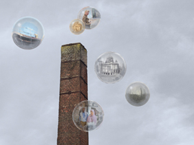 At the end of the 19th Century amongst the city of Roubaix’s thousand factory chimneys there was also that of an industry made famous by one Victor Vaissier. He was a man gifted with extraordinary inventiveness who, by launching his soap in an inspired manner, created a world of legend and poetry. Inventing personally his publicity campaigns he assumed the persona of the King of the Congo and created his Soap of the Princes of the Congo. To promote his industrial activity he built in Tourcoing a magnificent castle in oriental style and organized festas, his cavalcades which outdid the carnivals of the period. Today only 38 chimneys survive in Roubaix. Victor Vaissier’s chimney together with the gatehouse of his castle are the only remaining vestiges of a mythical empire, now, alas, forgotten. In The Eruption of the End his historic chimney comes back to life. In the images reflected in soap bubbles that issue from it in a final eruption one voyages between past and present. The soap bubbles, the medium for the projected images, react to the movement of viewers, showing archive footage and photos of the life of industrial workers of the past. As the visitor draws closer to the screen the bubbles reveal images of the present. The socialist anthem The Internationale, the music for which was composed in Lille barely a year after the opening of Victor Vaissier’s factory, provides the soundtrack for the installation, along with voices from period newsreels and contemporary interviews. The Eruption of the End pays homage to the lives and work of the people of this place and to their cultural heritage. The work recounts a process, and is the expression of the artist’s search for contact with the life of a place and its historical experience.